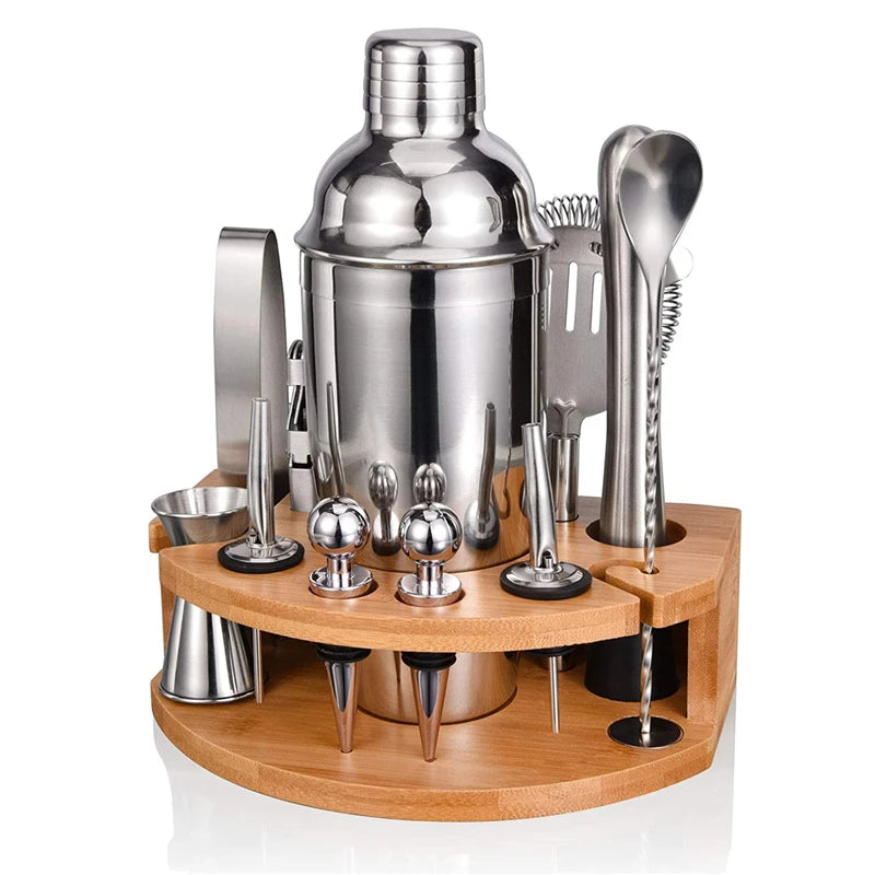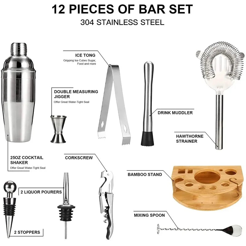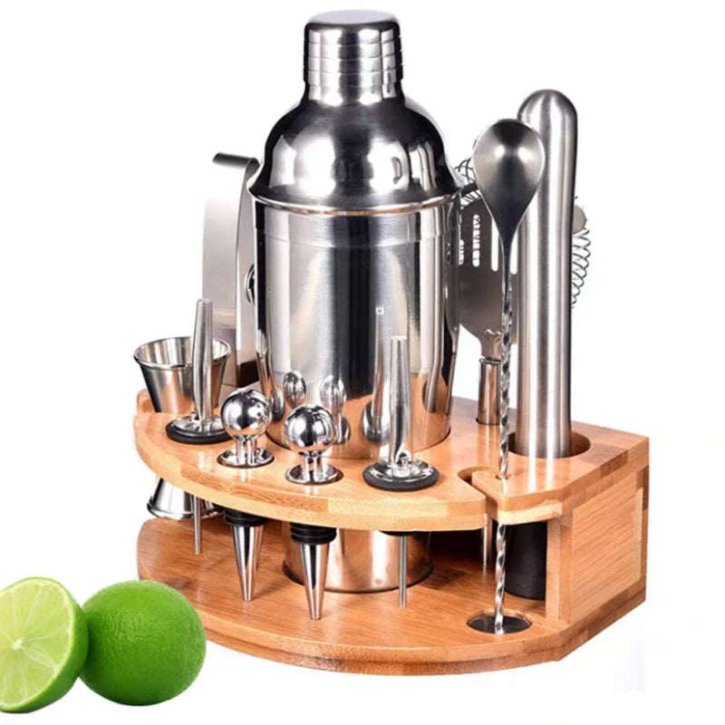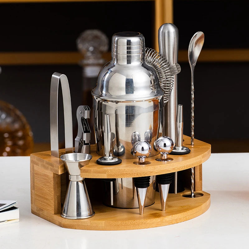 ערכת ברמן יוקרתית הכוללת את כל הכלים הדרושים לערבוב קוקטיילים, ארוזה באופן אסתטי על מעמד עץ במבוק איכותי ונוח לשימוש. מושלם לחובבים ולמקצוענים כאחד!